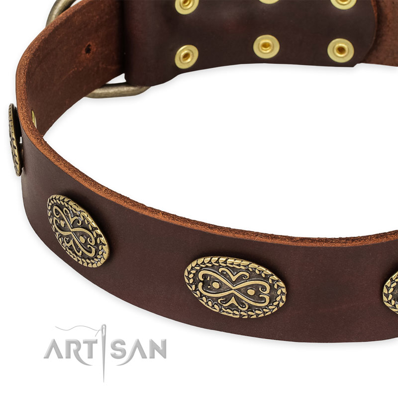 Designer FDT Artisan Brown Leather Dog Collar with Bronze Look Plated Ovals
