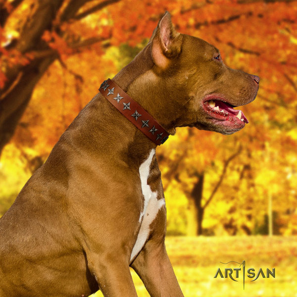Pitbull easy adjustable full grain genuine leather dog collar with remarkable decorations