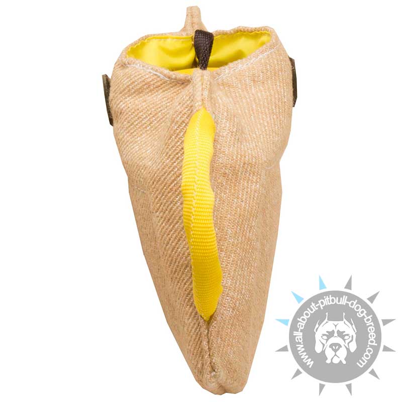 This product is made of strong jute, which is resistant to tearing and hard to bite through. This reliable item is hand stitched for better durability. The high quality of the gear will guarantee you its long service life. By the way, have no doubts in its safety. First of all jute is natural, thus harmless material. From the other side, there are no metal or plastic parts on the surface of the bite builder, so it won't cause injuries to the teeth.