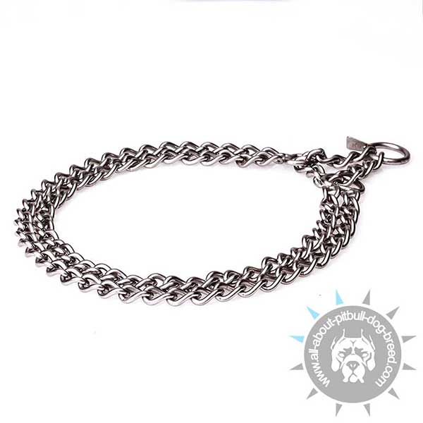 Firstly, it should be mentioned that this chain collar looks much more attractive than ordinary ones due to the unusual design. It consists of 2 chains properly welded together. That makes the collar look extraordinary and increases its tensile strength as well. Besides, thanks to such a convenient construction, the chains won't be twisted together.