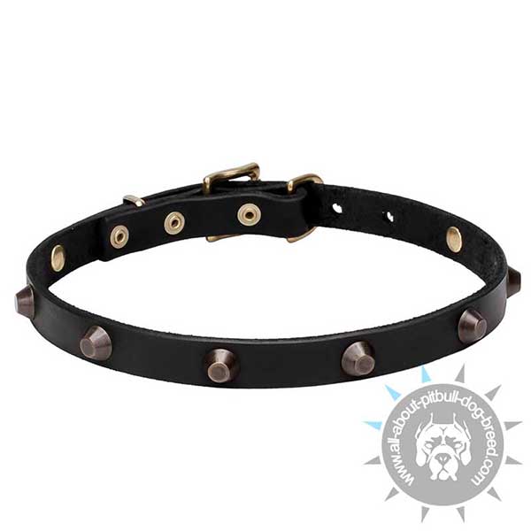Like the collar itself, the hardware is strong and sturdy. There is a reliable buckle closure that will provide quick and  easy adjustment. A massive D-ring is meant for leash attachment. All the hardware, as well as the decorations, are made of brass, it means they will preserve their look and won't rust or corrode. Old-looking cones, arranged in a vertical line along the collar, make the item not an ordinary training or walking tool but a stylish outfit for underlining the dog's beauty and your taste. There is no doubt that they will not fall out, as smooth rivets securely keep them inside.