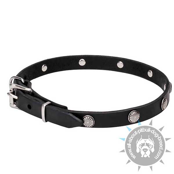 The uniqueness of this collar is its elegant decorations. It looks extremely stylish and extraordinary thanks to chrome plated studs with engraved flowers. Don't be afraid, they won’t fall off because they are reliably fixed with rivets. All the fittings are protected from rust and corrosion with chrome covering.